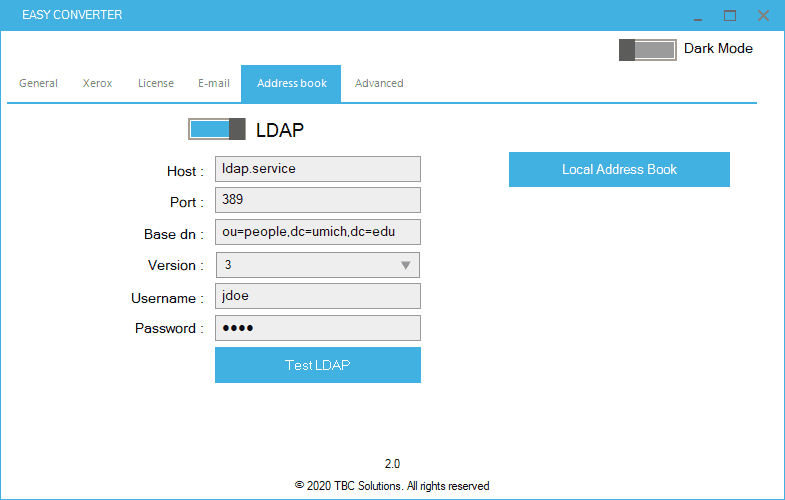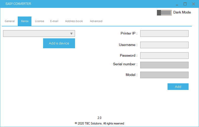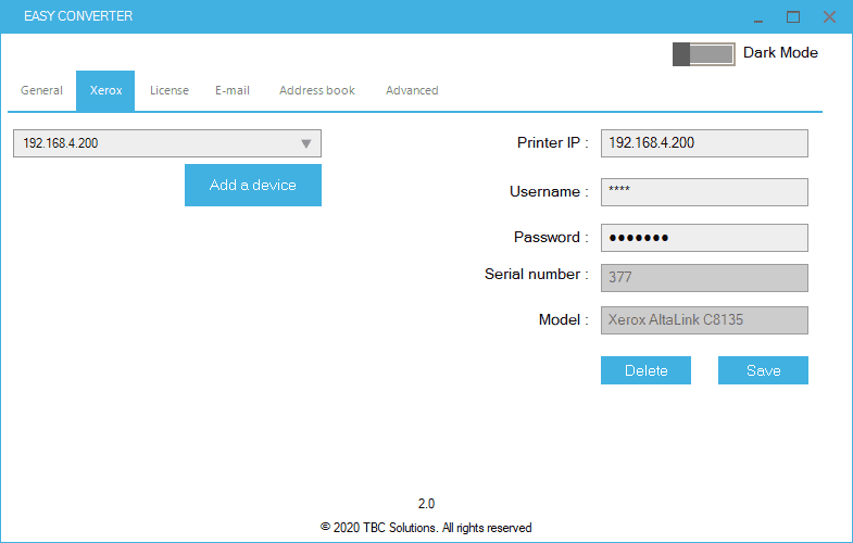 Enter the IP of the MFP on the network, the name of the admin user and the password, then click on save.